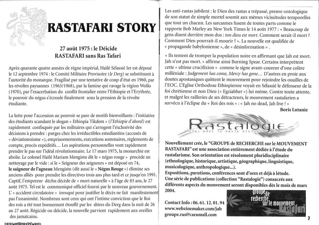 - pages 6-7 Rastafari Story « 27 août 1975 : Le Déicide – RASTAFARI sans Ras Tafari » par Boris Lutanie
