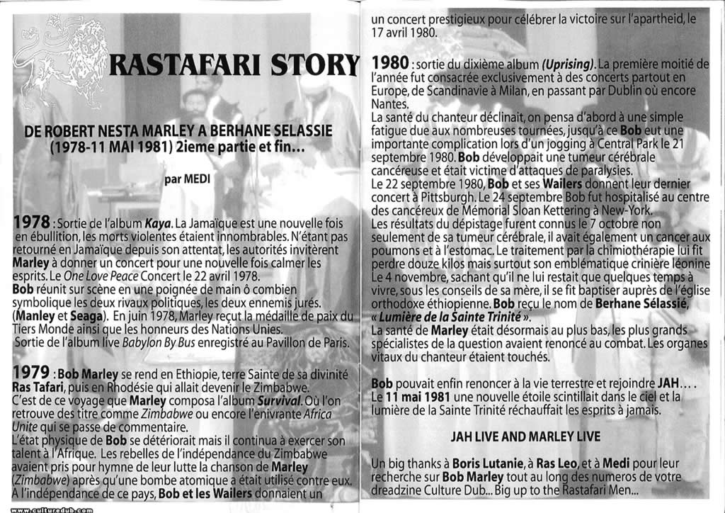- pages 4-5 Rastafari Story « De Robert Nesta Marley à Berhane Selassié » 2ème partie par Médi