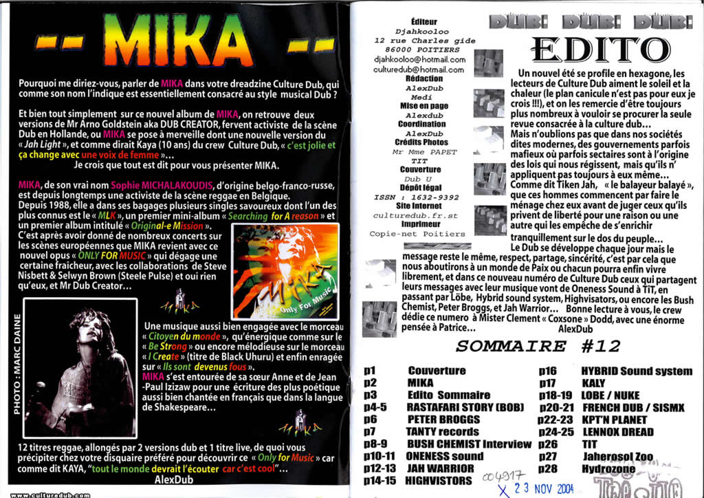 Culture Dub n°12 page 1 Couverture n°12 Juin 2004 Culture Dub n°12 pages 2-3 Mika Culture Dub n°12 pages 4-5 Rastafari Story Culture Dub n°12 pages 6-7 Oneness Sound System - I Natural / Ras IyahCulture Dub n°12 pages 8-9 Kenny Knots meets Bush Chemists Culture Dub n°12 page 10-11 Lush Records Release Peter Broggs - Tanty Records Culture Dub n°12 pages 12-13 Jah Warrior Culture Dub n°12 pages 14-15 Improvisators Dub metts Hightone Culture Dub n°12 pages 16-17 Löbe Rabiant Dub System Culture Dub n°12 pages 18-19 Kaly Live Dub Culture Dub n°12 pages 20-21 T.I.T Culture Dub n°12 pages 22-23 Kpt'N Planet Culture Dub n°12 pages 24-25 Lennox Dread - BiotekdubCulture Dub n°12 pages 26-27 French Dub System Vol.1 - Jaherosol Zoo Culture Dub n°12 page 28 Hydrozone Flyer