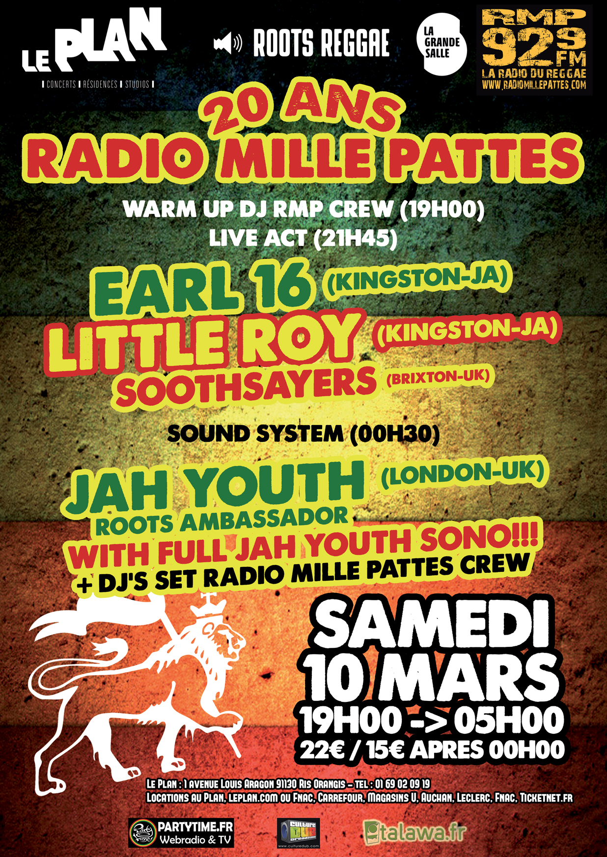 Afin de célébrer dignement ses 20 ans de diffusion sur la FM, Radio Mille Pattes, unique radio FM consacrée au reggae, vous propose une affiche exceptionnelle dans la Grande Salle du Plan (Ris-Orangis/91, 45 minutes de Paris) le samedi 10 mars!