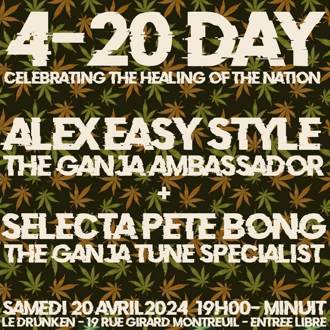 Venez fêter le 420 Day au Drunken à Montreuil de 19h à minuit avec au platines @alexeasystyle The Ganja Ambassador et Selecta Pete Bong The Ganja Tune Specialist.