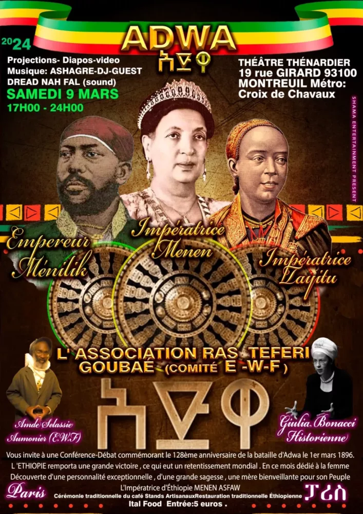 L’association Ras Teferi Goubaé (Comité Ethiopian World Federation) vous invite à une conférence-débat commémorant le 128ème anniversaire de la bataille d’Adwa le 1er mars 1896, une grande victoire éthiopienne.