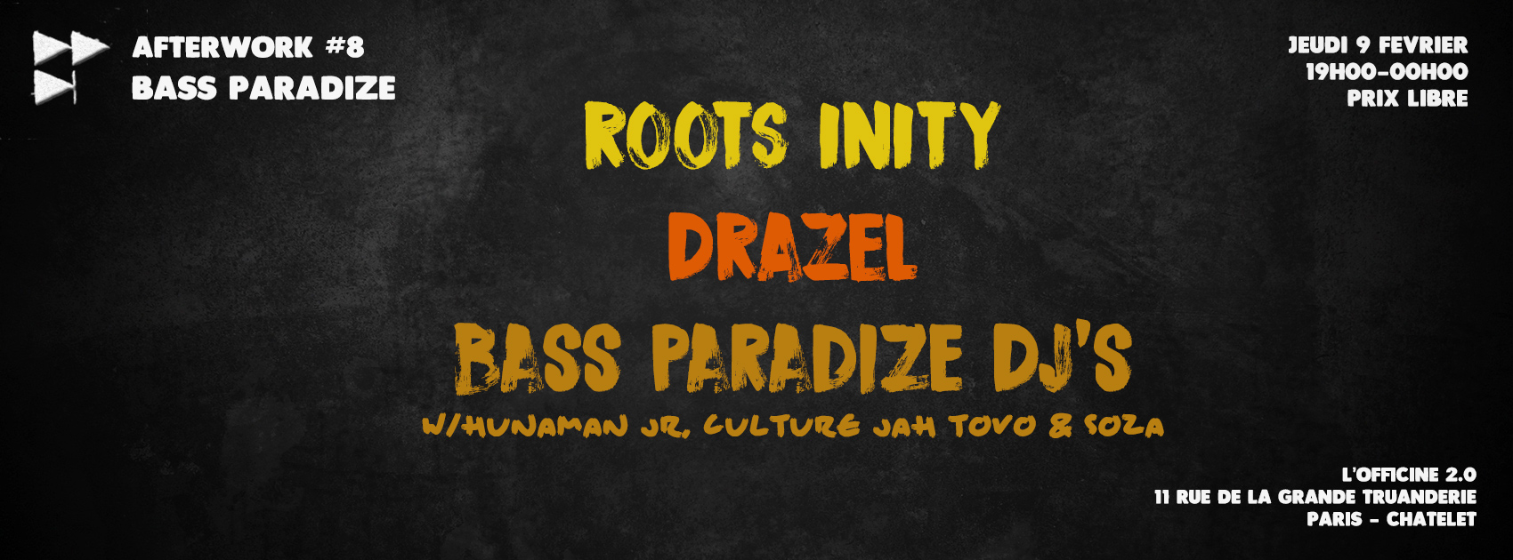 Afterwork à Prix Libre à L’Officine 2.0 avec cette fois Roots Inity Sound System, collectif en provenance des Yvelines et à l’origine des soirées Yvelin’DUB, puis Drazel (Exploration Music / SeekSickSound) qui nous revient pour un set DnB « only vinyls ». Côté Bass Paradize, c’est Hanuman Jr. qui démarrera la session.