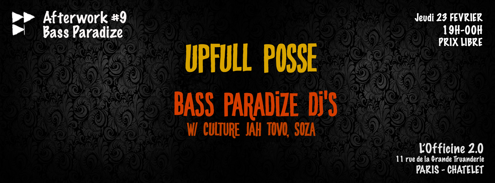 Afterwork à Prix Libre à L’Officine 2.0 pour une session Roots, Reggae, Dub, Dubstep, Grime… avec cette fois Upfull Posse, sound system parisien à l’origine, entre autre, des soirées Mic Attack, puis Soza et Culture Jah Tovo pour représenter Bass Paradize, et Khrr en special guest :