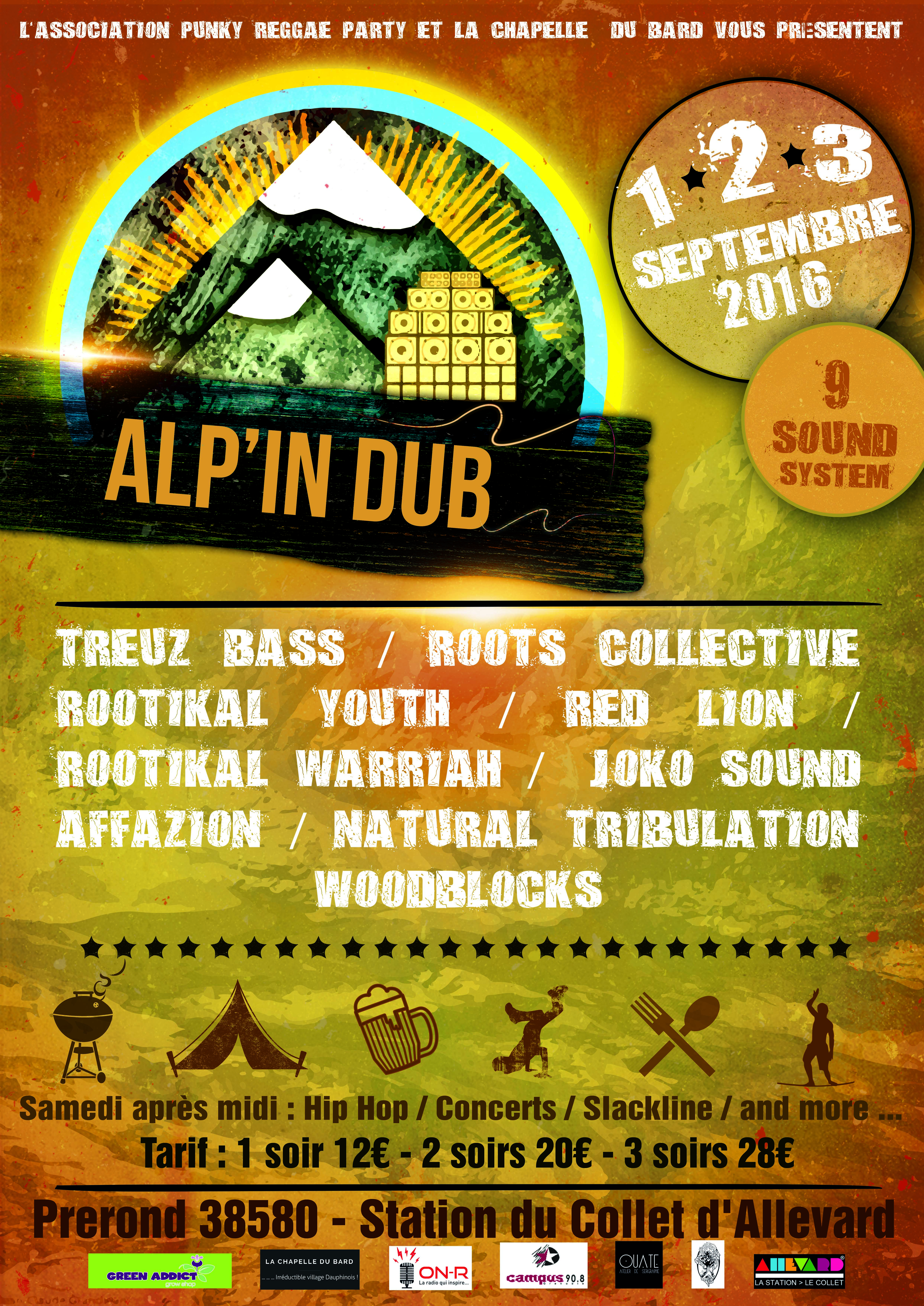 ///////////////////////////////////// 9 SONOS ///////////////////////////////////////////rnL’association PUNKY REGGAE PARTY et la commune de la Chapelle-du-Bard présentent la seconde édition du festival :rnALP’IN DUBrnLes 1, 2 et 3 septembre 2016rn45Min de GRENOBLE et CHAMBERYrnrnVenez nombreux fêter la fin de l’été sur le site verdoyant de Prerond , au dessus du Collet d’Allevard .rnAprés une première édition réussie on remet ça en plus gros !!rn3 jours de sound pour cette scène locale qui ne cesse de grandir.rnDes animations, des concerts, des concours et des lots a gagner !!rnrnrnAU PROGRAMME :rn3 JOURS DE SOUND SYSTEMrnrn>AFFAZION sound systemrnhttps://www.facebook.com/bredda.affazion?fref=tsrnrn>TREUZ BASS sound systemrnhttps://soundcloud.com/calimstepparnhttps://soundcloud.com/treuzz-bassrnrn>WOODBLOCKS sound systemrnhttps://www.facebook.com/MaxWoodBlocks?fref=tsrnrn>ROOTIKAL YOUTH sound systemrnhttps://www.facebook.com/rootikalyouth/?fref=tsrnrn>ROOTS COLLECTIVE sound systemrnhttps://www.facebook.com/RootsCollectiveGrenoble/?fref=tsrnrn>ROOTIKAL WARRIAH sound systemrnhttps://www.facebook.com/ROOTIKAL-WARRIAH-SOUND-SYSTEM-198987537189/?fref=tsrnrn> NATURAL TRIBULATION sound systemrnhttps://soundcloud.com/natural-tribulationrnrn> JOKO sound systemrnhttps://soundcloud.com/joko-sound-systemrnrn>RED LION sound systemrnhttps://www.mixcloud.com/RedLionSound/rnrnrnANIMATION, CONCERT…….rn9 SONOS !!rnrnrnBuvette, Camping gratuit, Restauration sur place.rnrnPAF : 12€ 1 soir / 20€ 2 soirs / 28€ 3 soirsrnrnCarte Bleue sur place !!!