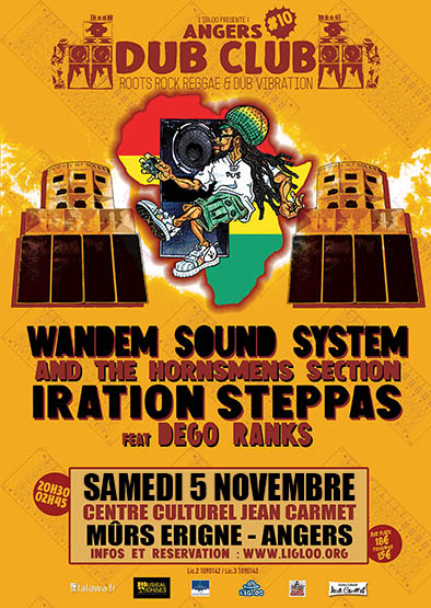 L’Igloo présente Angers Dub Club 10 – Samedi 5 novembre 2022 – Iration Steppas Feat. Dego Ranks + Wandem Sound System & The Hornsmen Section – Centre Culturel Jean Carmet de Murs Erigné (49).