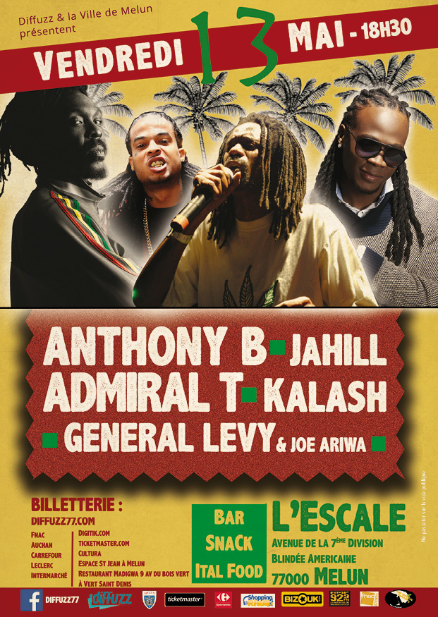 Un évènement à Melun ce 13 mai, le plus gros plateau Reggae Ragga Dancehall en ile de France pour ce printemps. Découverte, Nouveauté, valeurs sures et son massif voilà ce qui vous attend à L’Escale de Melun. Admiral T et Anthony B deux poids lourds du Dancehall seront talonnés par la jeune garde représenté par Kalash en pleine explosion. General Levy sera à découvrir sur scène pour sa première venue dans le sud 77. Enfin Jahill pour présenter la soirée en MC et ouvrir le show avec quelques titres.