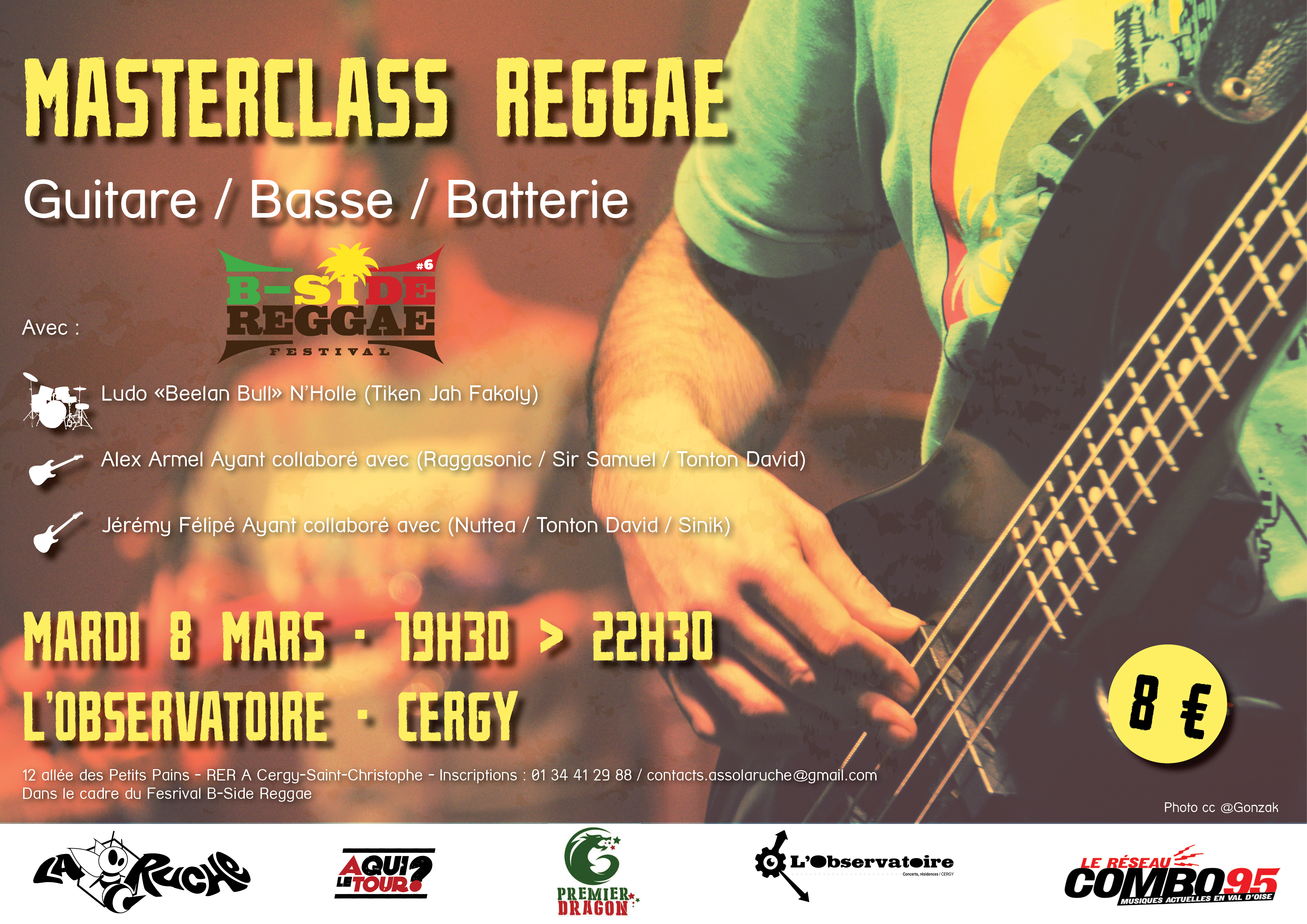 Dans le cadre du B-Side Reggae Festival, les musiciens souhaitant améliorer leur jeu sont invités à participer à cette masterclass dédiée et animée par trois experts : Ludo « Beelan Bull » N’Holle, batteur de Tiken Jah Fakoly, Alex Armel, guitariste ayant collaboré avec Raggasonic, Sir Samuel ou Tonton David et enfin Jérémy Félipé, bassiste ayant collaboré avec Nuttea, Tonton David et Sinik. Ils vous proposent de revenir sur les divers styles qui composent la musique Reggae comme le Roots, l’Afro Reggae, le Dancehall ou la Dub à travers divers patterns rythmiques (early reggae, one drop, roker, stepper…).