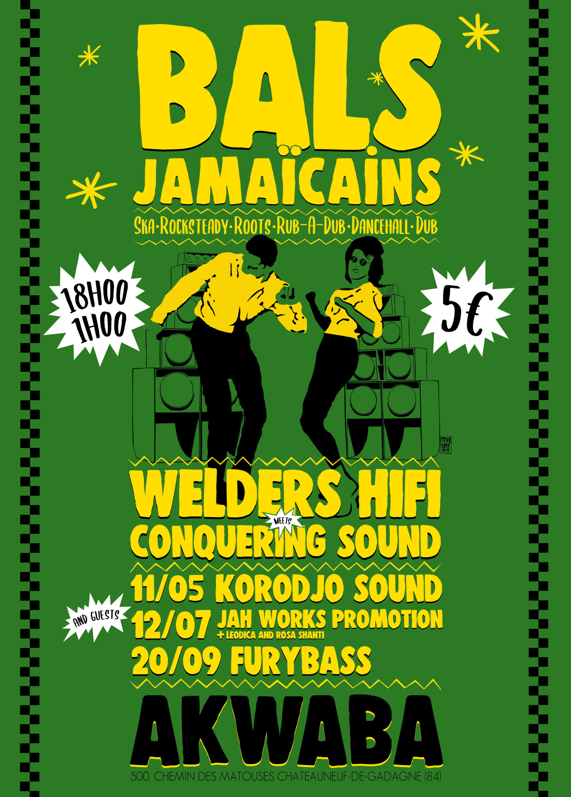 Ska, rocksteady, roots, rub-a-dub, dancehall, dub… La tradition du sound-system à la jamaïcaine se décline en version provençale. Le duo de selectors local Conquering Sound invite à chaque rendez-vous un crew du coin à jouer ses galettes sur la sono artisanale de Welders Hi Fi installée dans la cour d’Akwaba comme dans une rue de Trench Town. Spécialités caribéennes et locales à déguster en écoutant du bon son. Voyage dans le temps et dans l’espace garanti !