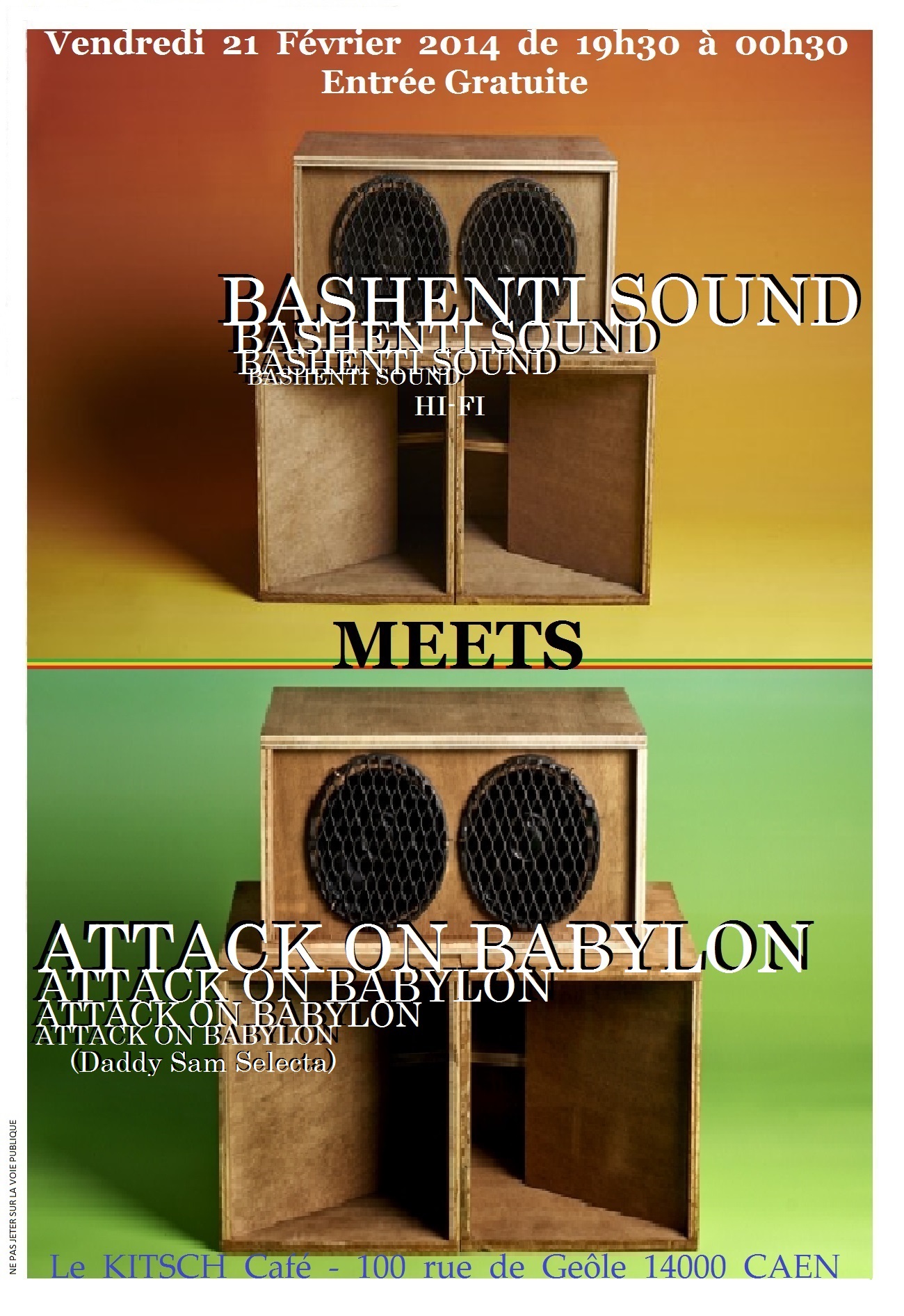Sur son système artisanal, Bashenti sound proposera une sélection pointue tournée vers le roots and dub, tandis que le AOB représenté par son selecta désormais caennais vous fera vibrer sur des tunes allant du rocksteady au dub en passant par du roots rockers.