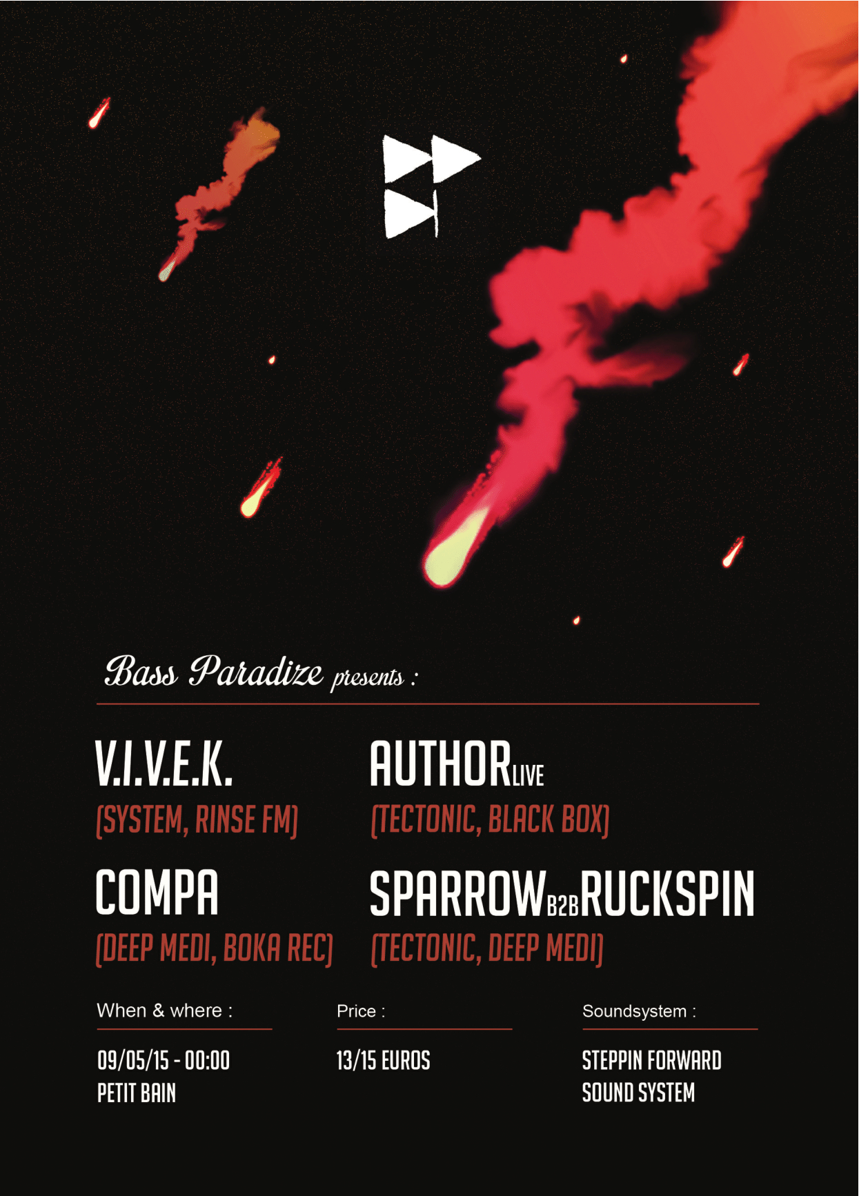 Pour cette 3ème édition des Bass Paradize, nous avons l’immense plaisir d’inviter V.I.V.E.K. à Paris au Petit Bain. Auteur des fabuleux « asteroids » et « soundman VIP », il est aussi le boss du label System et l’initiateur avec Mala des soirées du même nom, dont la particularité est la création par V.I.V.E.K. lui même du Sound System optimisé pour la bass music et qui est devenu la référence a Londres pour tout amateur de vrai dubstep. Bass Paradize s’en inspire directement en faisant appel au crew STEPPIN FORWARD et son Sound System de 7kw, inédit dans les soirées bass music a Paris.