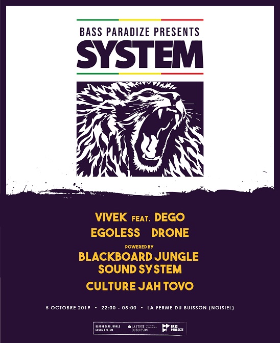 Après une première collaboration entre le label System et le collectif parisien Bass Paradize en janvier dernier, les deux entités récidivent à la Ferme du Buisson ! Vivek, fondateur du prestigieux label londonien, sera de nouveau présent avec l’habituel MC Dego Ranking, auquel s’ajoutent EGOLESS et Drone pour représenter l’écurie SYSTEM. Le tout sera sonorisé par le Sound System de Blackboard Jungle pour profiter de la plus belle des façons des basses fréquences ! Culture Jah Tovo, résident Bass Paradize, aura la lourde tâche de conclure les débats…
