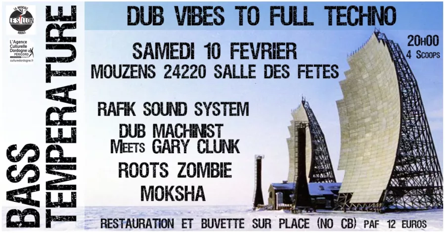Au programme, on commencera à se dégourdir les jambes sur la sélecta Reggae Dub extrêmement pointue, du RAFIK SOUND SYSTEM, bien connu du public périgourdin, qui nous fait l’honneur de sonoriser cette soirée ! Les deux producteurs bordelais DUB MACHINIST et GARY CLUNK seront aussi de la partie et nous promettent un set à 4 mains aux confins du Dub, qui va très sérieusement monter la température de la salle ! Pour continuer, il faudra probablement enlever la combi de ski, car le fameux duo ROOTS ZOMBIE a accepté notre invitation et viendra enflammer le dancefloor avec leur excellent set Electro Dub ! Enfin, le talentueux MOKSHA aura la dure mission de finir d’enjailler cette soirée avec un set Full Techno des plus bouillant !!!