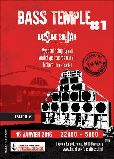 Pour cette première « Bass Temple », on reste en famille, avec les frères de Mystical rising, archetype records et Ma-Kata chanteuse du Doctor red dub band, le tout sonorisé par bassline soljah sound system en mode FULL SOUND! (6scoops)