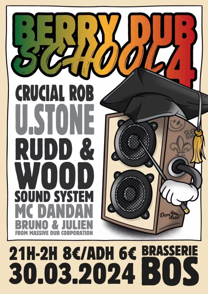 Dem’Asso et la Brasserie Bos ont le plaisir de vous inviter le samedi 30 mars 2024 pour la quatrième édition des Berry Dub School.