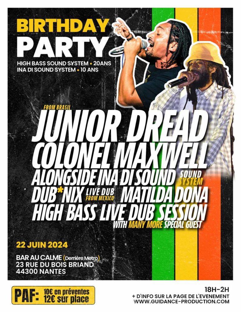 Retrouvez-nous le 22 Juin au Bar Au Calme pour fêter ensemble « avec 1 an de retard » les 20 ans d’activité dans la scène Nantaise de l’Association et Sound System « HIGH BASS » depuis 2003 maintenant ainsi que les 10 ans du Sound System « INA DI SOUND » très actif sur la région Nantaise depuis 2013…