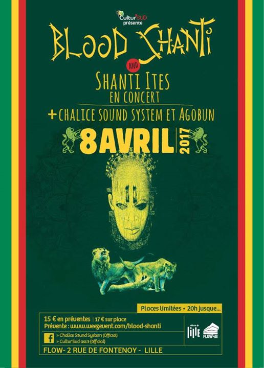 Le Samedi 8 Avril à Lille au « Flow » 2 Rue de Fontenoy, Blood Shanti en concert accompagné de ses musiciens (à ne pas confondre avec la formule « Trinity Force » qui allie Batterie Live et machine, excellent au demeurant..,cette fois ci ,le chanteur batteur, collone vertebrale du Aba Shanti-I Sound, vient accompagné de tout ses musiciens (notamment Jahmel et Cyrus des Ras-Ites!!) et de ses ingénieurs du Son (William the Conqueror et Fuzzy D).