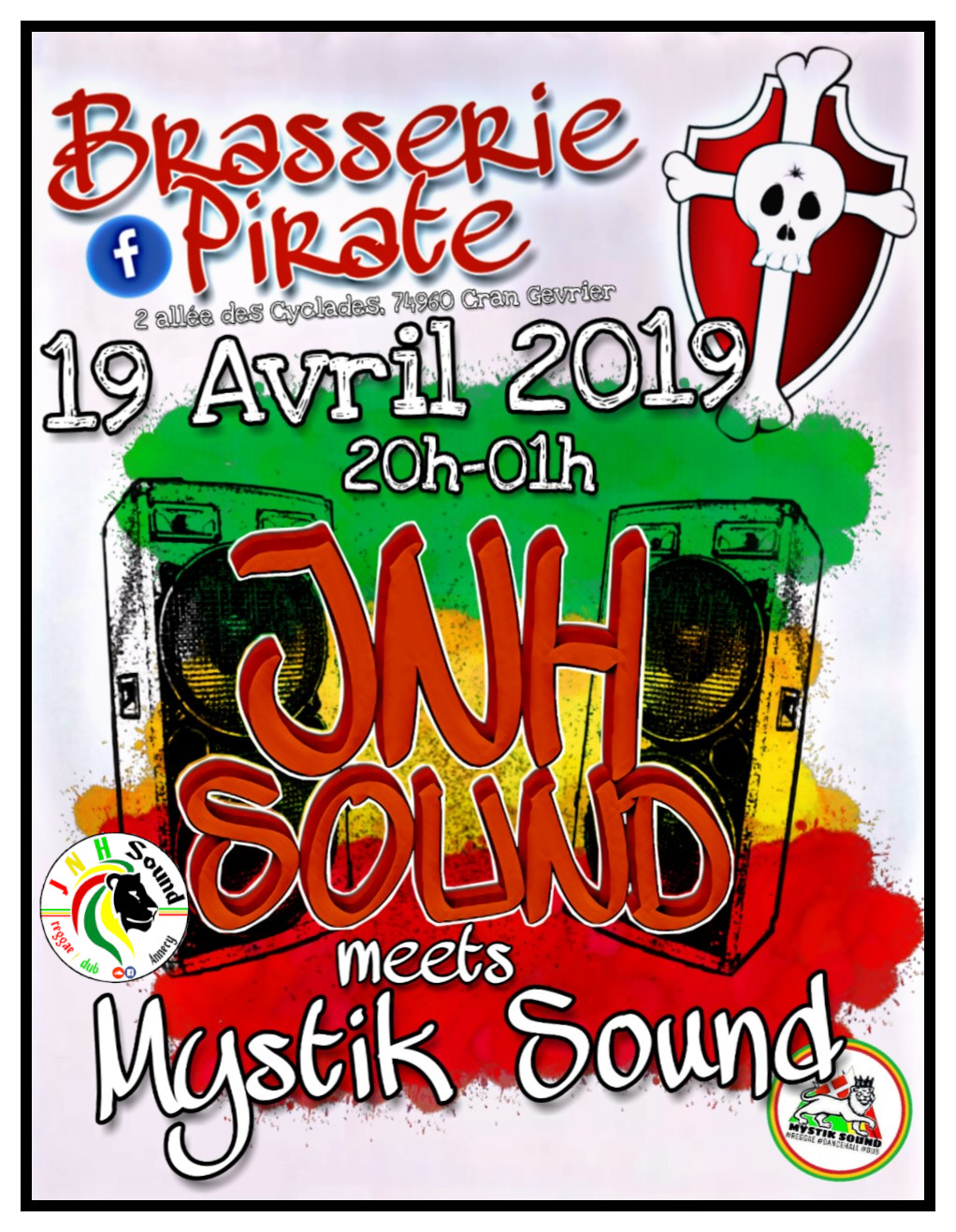 Pour la première fois le JNH Sound aura le plaisir de vous accueillir à la Brasserie Pirate de 20h à 1h du matin. Nous sommes un jeune Sound System d’Annecy aux styles » Roots Reggae Dub » JNH Sound est composé de JohNagi (John Jln), Torogo (Hugo Lery) et NSF (Noé Lafarge) Il ne sera pas présent mais une grosse pensée a lui.