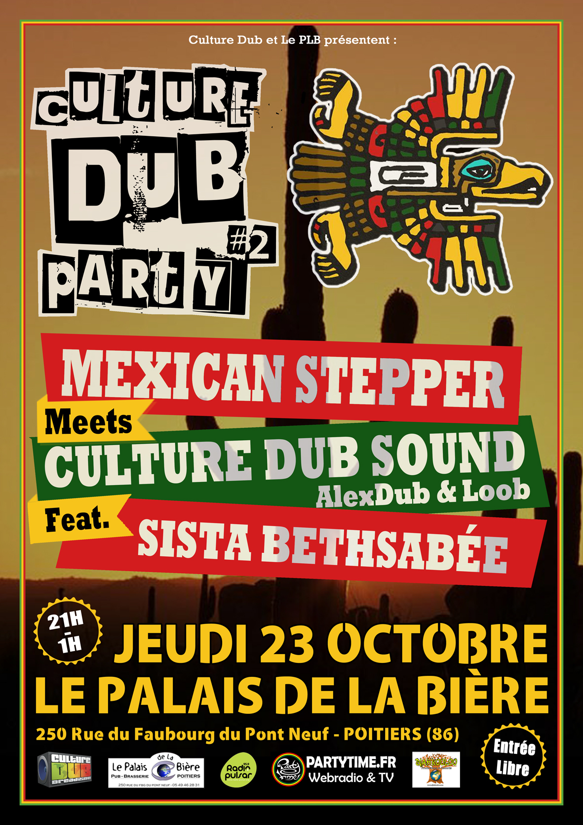 Après une première session d’anthologie au Météo, les Culture Dub Parties débarquent au PLB !!! Et pour ouvrir la saison, le Culture Dub Sound (AlexDub & Loob) accompagné de la chanteuse Sista Bethsabée invitent Mexican Stepper ! Arrivant tout droit du Mexique, ce sera sa première date en France !!! À ne louper sous aucun prétexte…!!!