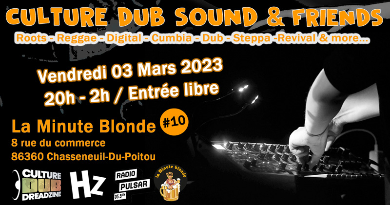 Quelques semaines avant de retrouver les sessions Outdoors, venez partagez une vibes réchauffante avec le Culture Dub Sound à La Minute Blonde de Chasseneuil-Du-Poitou le Vendredi 03 Mars 2023 de 20h à 2h !