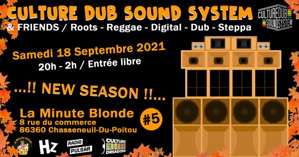 Après quatre sessions mémorables, pour fêter un été des plus chaleureux, pour annoncer une nouvelle saison en musique, retrouvez exceptionnellement le Culture Dub Sound System avec ses 4 SCOOPS accompagné d’invités surprises à La Minute Blonde de Chasseneuil-Du-Poitou le Samedi 18 Septembre 2021 à partir de 20h pour une cinquième session que vous n’êtes pas près d’oublier !