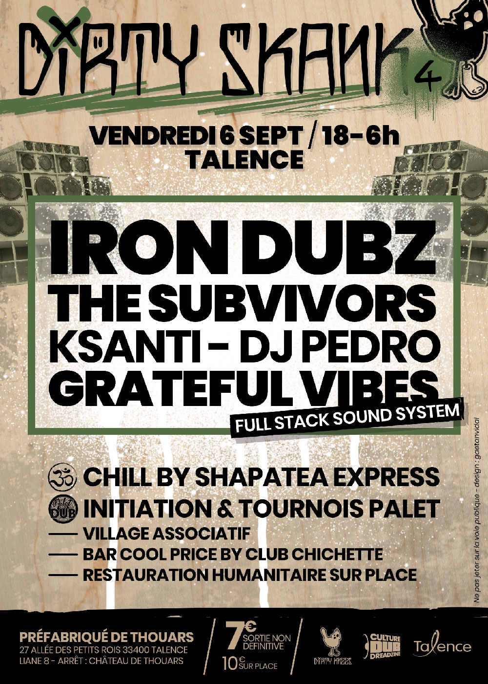 La Dirty Skank c’est un mix entre Live Dub & Sound system ! Après 3 éditions hautes en couleurs avec Kandee, Weeding Dub, R-DUG, Brainless, Skunk Kut ft Monkey D, Stepper Sons, Infinity Hi-Fi, ZOULOU, Lyrical Bass & Ital Vibes Sound System nous revenons pour une quatrième édition. Au menu, Iron Dubz, The Subvivors, Dj Pedro, Ksanti et Grateful Vibes full stack.