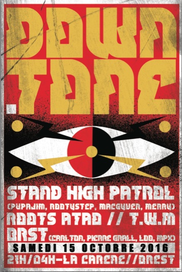 Les soirées « DownTone » débarquent à Brest ! Pour cette première DownTone finisterienne les dubadub musketeerz de Stand High Patrol partageront le soundsystem avec ROOTS ATAO et T.W.M. La grande salle de la Carène accueillera donc une véritable session soundsystem au cours de laquelle Stand High Patrol assurera un live d’au moins quatre heures! Coté club c’est le collectif brestois BR/ST qui sera aux commandes. Carlton, Loo, Pierre Grall et MPX se partageront les platines tout au long de la soirée pour nous faire découvrir leurs prods et leurs toutes dernières trouvailles. Coté images et vidéos Kazy et Diazzo se chargeront d’habiller la grande salle tandis que DaFF officiera du coté de chez BR/ST. Du dub à la techno en passant par le reggae, le hiphop, ou la house, la « DownTone » invite à décloisonner les styles et à palper les ponts qui les unissent.