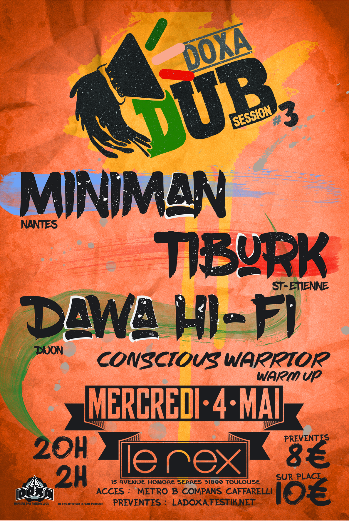 Pour cette troisième édition de la « Doxa Dub session », la scène Dub française sera une nouvelle fois représentée dans sa diversité. Le style voguera entre l’Electro-Dub vintage de Dawa-Hifi, et un son plus moderne flirtant parfois avec du Dubstep (Tiburk). Sans oublier l’ambiance hypnotique propre à l’univers sonore de Miniman. Un mélange des styles et des générations qui promet d’être explosif ! A noter que Tiburk et Miniman ne se sont pas produits à Toulouse depuis respectivement 2011 et 2013 !