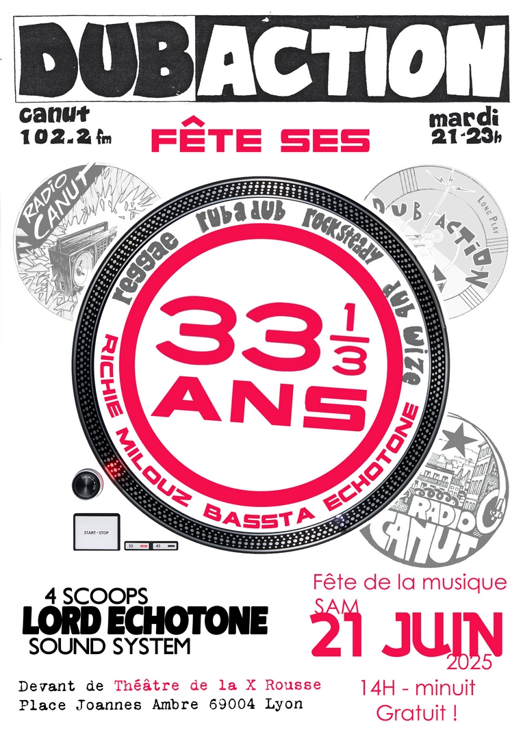 Pour cette fête de la musique on célèbrera les 33 ans de la Dub Action, à l’antenne sur Radio Canut tous les mardi depuis 1991…
