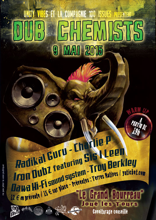 La Compagnie 100 issues et l’Association Unity Vibes sont heureuses de s’associer pour organiser cette soirée « Dub Chemists », le 9 mai 2015.
