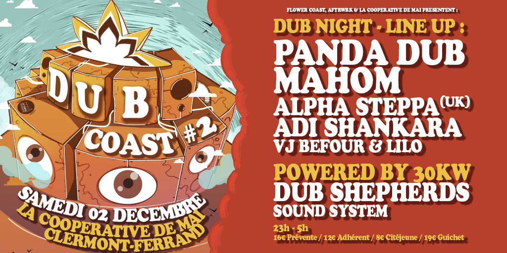 Après la réussite de la 1ère édition en décembre 2016, FLOWER COAST et LA COOPERATIVE DE MAI s’associent à nouveau pour une nouvelle nuit dédiée à la culture dub et sound system. La sono de 30 KW des clermontois de DUB SHEPHERDS, accompagnée des pointures françaises et londoniennes du genre, viendront à nouveau faire résonner les basses de ce genre si particulier né des expérimentations de sorciers du son jamaïquains dans les années 70.