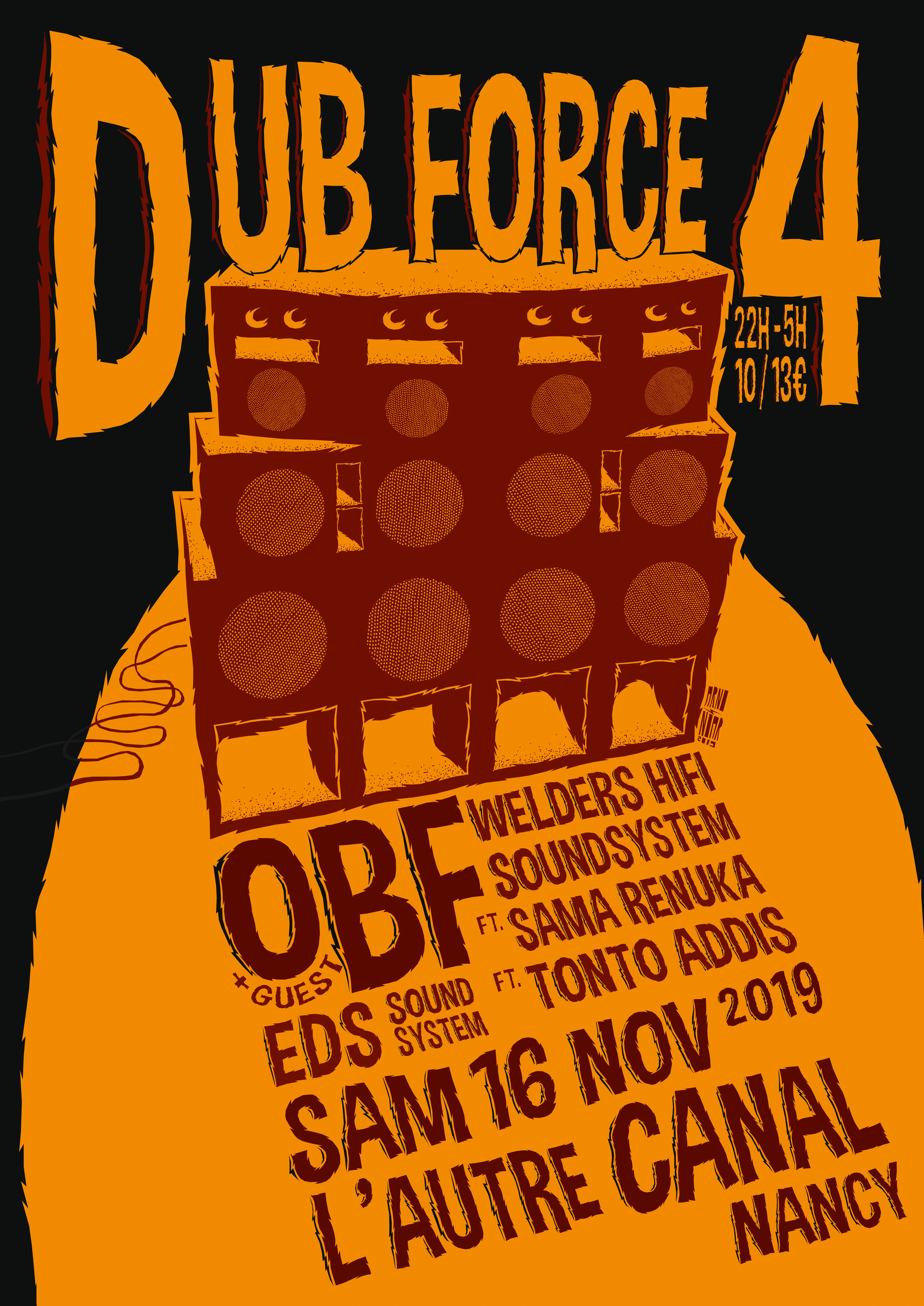 EDS Sound System est un collectif et un sound system organisateur des soirée Massive Dub et Dub Force sur la cité Ducale. RasNico, PoupaJohn, JahPi & Vainsyl au contrôle pour faire partager la culture sound system à l’aide de leur sono artisanale. Depuis les fondations du reggae jusqu’aux productions dub et stepper actuelles, à grand coup de vinyles et de morceaux exclusifs. Pour cette soirée particulière, EDS ramène aussi sa sono pour un meeting dans les règles de l’art et se prépare à faire trembler les murs de l’Autre Canal. Ils seront accompagnés de l’original rubadub master Tonto Addi tout droit venu de Berlin pour enflamer les faces B de ses lyrics engagés et de son flow inimitable. Strictly positive vibes !