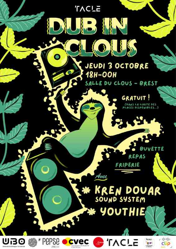 Belle soirée de rentrée organisée par ‘Tacle ce jeudi 3 octobre dans la salle du Clous ! Au programme de cet événement : du reggae, du dub, un sound system artisanal, une friperie, et une entrée libre et gratuite :o