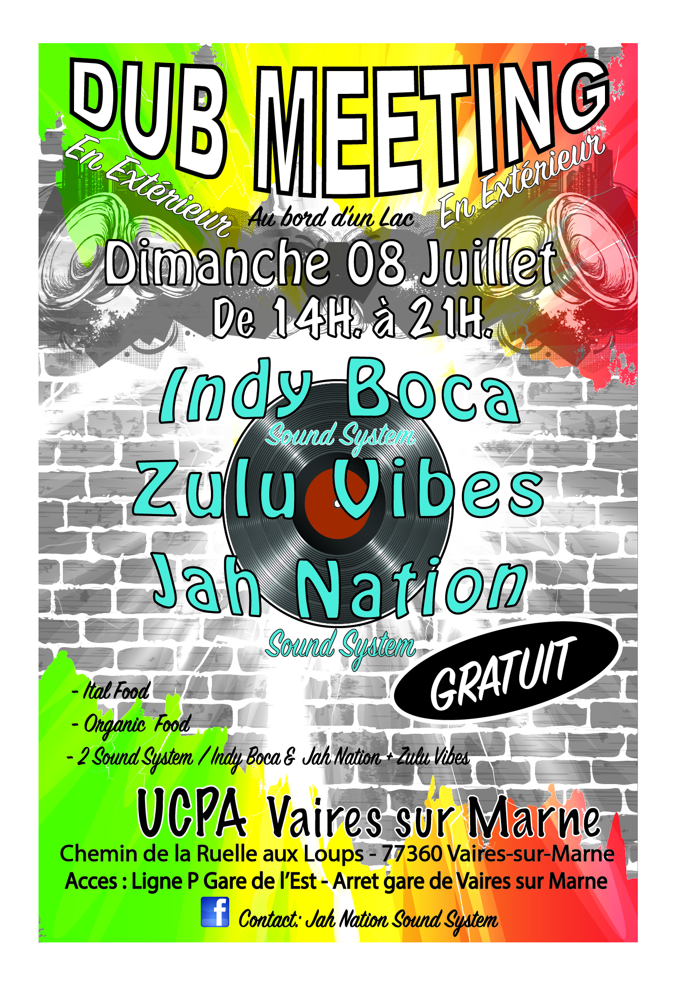 Salutations à tous, Voici la prochaine session de Jah Nation Sound System avec Indy Boca Sound System et Zulu Vibes en Dub meeting en extérieur près d’un lac avec sable et verdure… Gratuit. A l’UCPA Base de Loisirs de Vaires Chemin de la Ruelle aux Loups, 77360 Vaires-sur-Marne