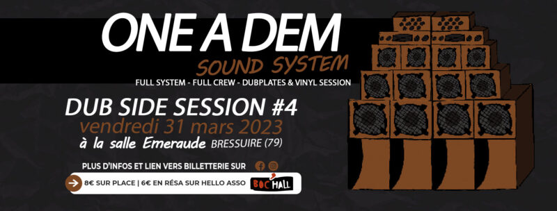 One A Dem Sound System revient à la salle Emeraude pour une nouvelle session en mode full Sound, full crew. Retrouvez toute la fine équipe qui vous prépare une sélection maison avec disques et dubplates. Au contrôle, King Vibration, Tom OAD et Iyah Flix pour une session en mode family. All tribes welcome
