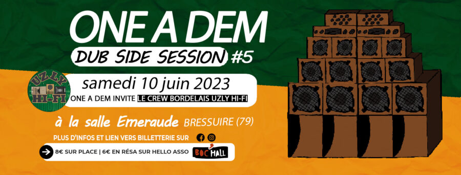 Pour cette 5e édition, on est content d’inviter le crew Uzly Hifi de Bordeaux. En début d’année, ils ont sorti une free release sur le label Culture Dub Records. « Without Connection » c’est trois versions chantées en compagnie de McGump et trois titres Dub à tendance Stepper. Ils viendront vous le présenter en live sur le One A Dem Sound System.