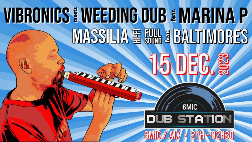 Pour cette 5ème édition des Dub Station à 6MIC, c’est un superbe plateau de producteurs qui vous est proposé avec la venue du duo Vibronics et Weeding Dub accompagné au micro par Marina P. Et les marseillais Massilia Hi-Fi et Baltimores vous présenteront leur premier album fraîchement sorti sur la full sono de MHF.