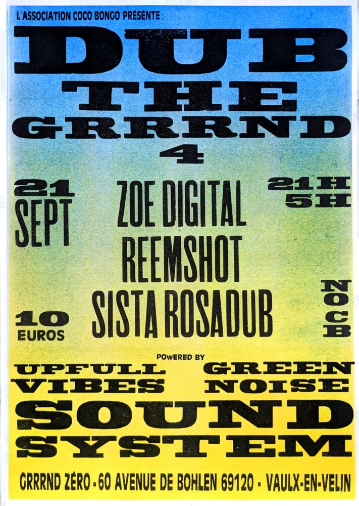 On ne range pas ses tongs, shorts et le soleil estival en cette fin d’été car l’association Coco Bongo vous annonce avec grande joie la 4ème ‘Dub The Grrrnd’! Parfaite pour faire danser vos corps bronzés à grands coups de dub et de basses! Ce samedi 21 Septembre 2024, cette déferlante de vinyles, dubplates, sirènes et autres gunshot en tout genre se fera aux commandes des 2 soundsystems artisanaux UpFull Vibes (Genève) et Green Noise (Lyon)!
