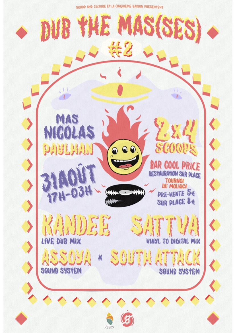 Scoop and Culture en collaboration avec l’Association La Cinquième Saison, vous présente la Dub the Mas(ses) #2, qui aura lieu le samedi 31 août de 17h00 à 03h00, au Mas Nicolas à Paulhan (34230).