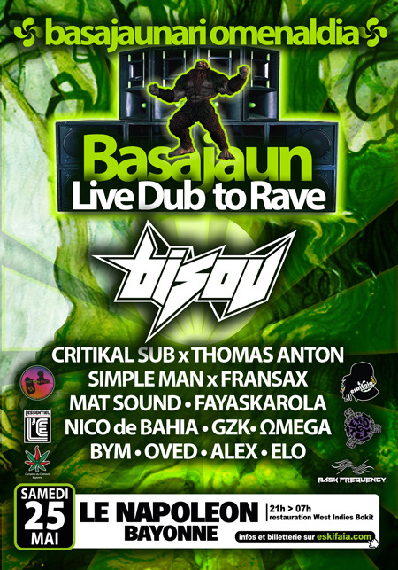 En tête d’affiche, nous accueillons le talentueux Bisou, prêt à vous entraîner dans un voyage musical inoubliable. Mais avant cela, laissez-vous transporter par les rythmes enivrants composé en live sur machine par Mat Sound, Simple Man accompagné de Fransax, suivi de Critikal Sub en duo avec Thomas Anton. Avec également la présence de DJ tels que Selecta Bym accompagné du chanteur Beña Ranks, la Djette Faya Skarola, DJ Nico de Bahia, l’équipe Eko6tem et l’équipe Bask Frequency pour la partie techno à 02h00. Cette soirée à Bayonne promet d’être magistrale et électrisante.