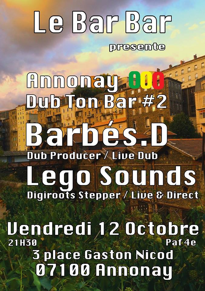 à Annonay le Bar Bar invite la Culture Dub dans le centre ville !! avec 2 artistes et activistes de ce style !! Barbés.D le dub producer qui lui enchaine les sorties vinyle , jouait par Jah Shaka , Channel One et bien des sound systems … Pour cette soirée il jouera ses productions sur une table analogique en multipistes in dub et Lego Sounds de retour en France viendra jouer son live & direct à découvrir