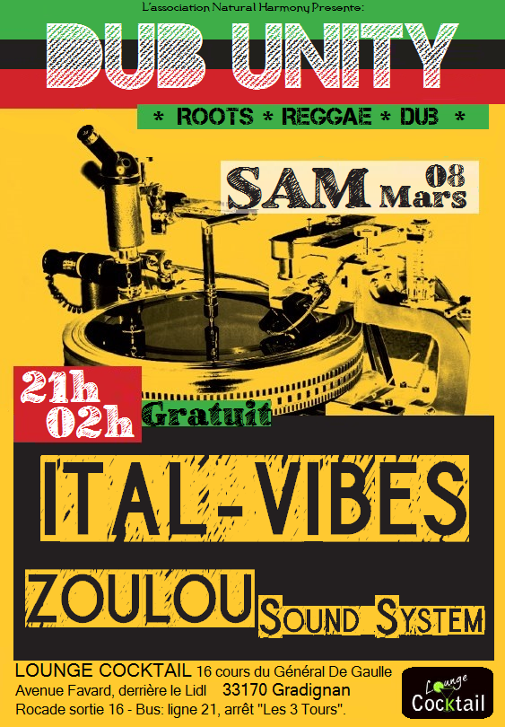 Pour cette toute première édition des DUB UNITY à Gradignan, l’association Natural Harmony et Zoulou sound system sont heureux d’inviter Ital Vibes, jeune collectif basé sur le Bassin d’Arcachon et bien connu des dernières soirées à la MAC.