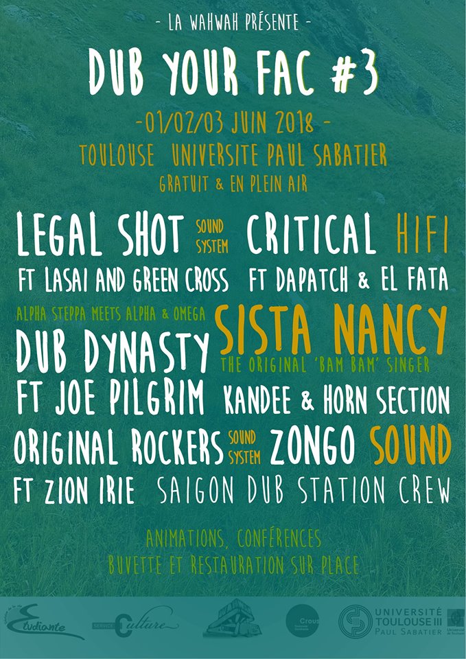 Avec Dub Dybasty ft Joe Pilgrim, Sista Nancy, Original Rockers ft Zion Irie, Legal Shot meet Critical Hi Fi alonside Dapatch, El Fata, Lasai and Green Cross,