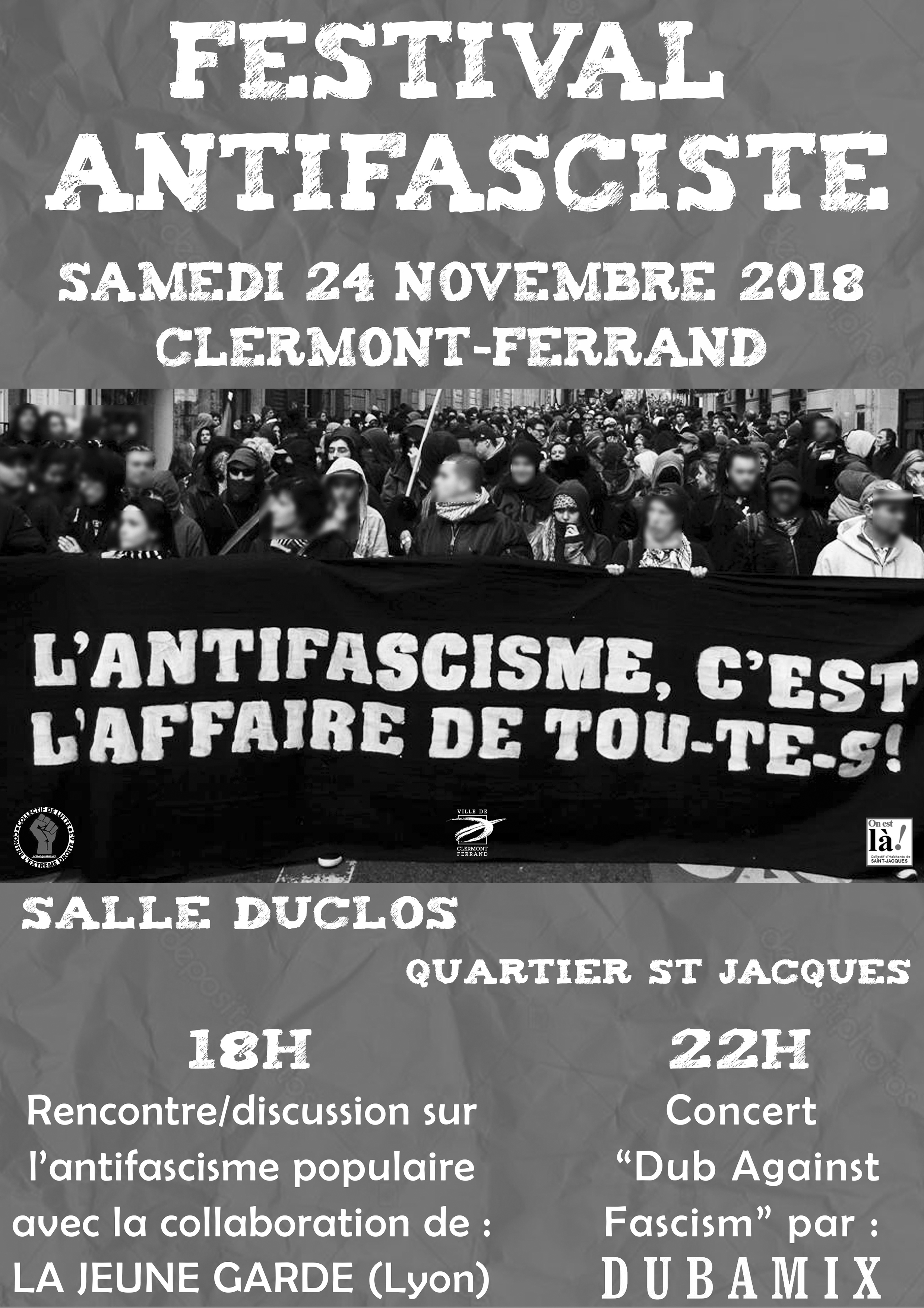 Le collectif LCED et le collectif « On est là » St Jacques sont très heureux de vous annoncer le FESTIVAL ANTIFASCISTE, samedi 24 novembre à la Salle Duclos du quartier St Jacques !