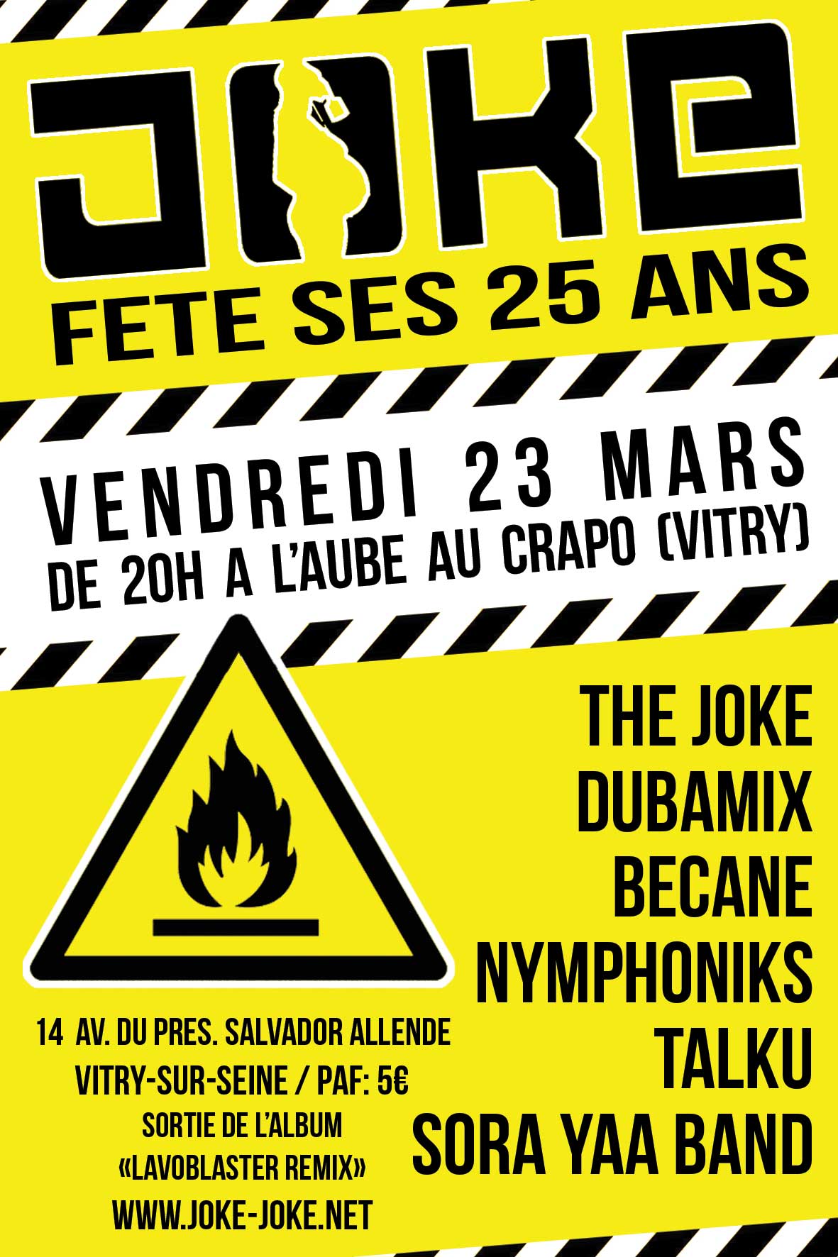 Après 25 ans de scènes françaises et internationales, JOKE s’invite au Le Crapo pour souffler des bougies de quart de siècle cuivrées, en fanfares et platines!