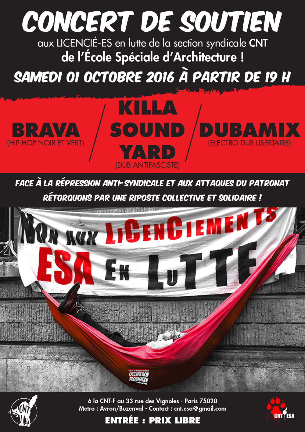 La section syndicale CNT-ESA ne se laisse pas décimer sans réagir, et continue la lutte. En plus des audiences au tribunal des Prud’hommes à venir, nous organisons un concert de soutien, entouré de nos camarades de Dubamix, KillaSoundYard et Brava, des musiciens engagés et militants. Nous vous invitons à venir nombreuses et nombreux les écouter et nous soutenir pendant une soirée musicale, solidaire et festive, et nous permettre de continuer à lutter, au tribunal mais aussi dans l’action syndicale directe.