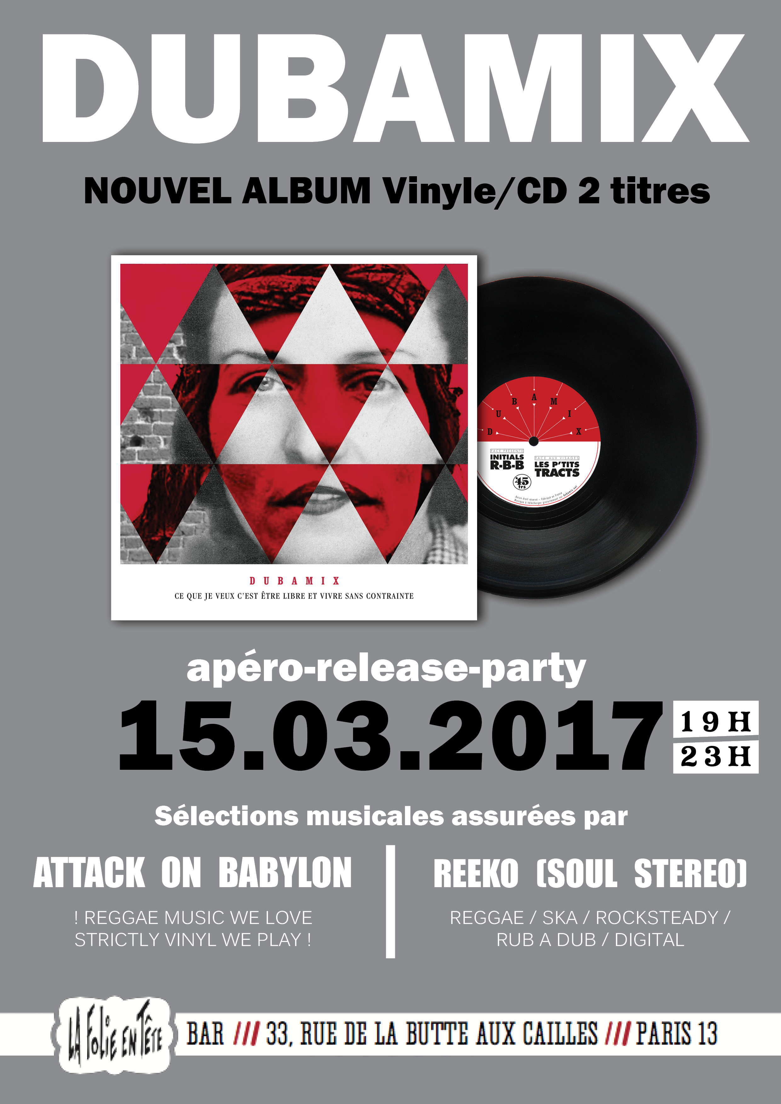 Pour fêter la sortie du vinyle*, Greg de DUBAMIX invite ses camarades Reeko de Soul Stereo et Fab & Julien d’Attack On Babylon à passer du son et faire quelques freestyles DJ vs SAX au bar « La Folie en Tête » le mercredi 15 mars 2017. Vous pourrez vous procurer ce nouvel album (en format Vinyle ou CD) dans une ambiance libertaire et subversive..