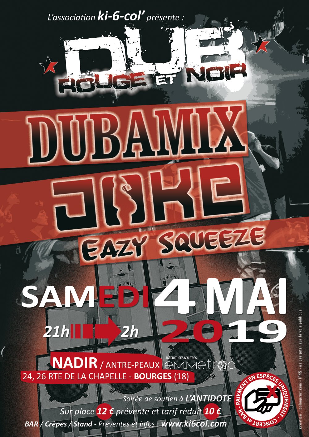 Voilà le programme que vous propose l’association ki-6-col’. Samedi 4 mai, nous recevrons au Nadir (Emmetrop), DUBAMIX & JOKE « Le Monde Bouge Tour », et EAZY SQUEEZE (SOUND SYSTEM Berruyer).