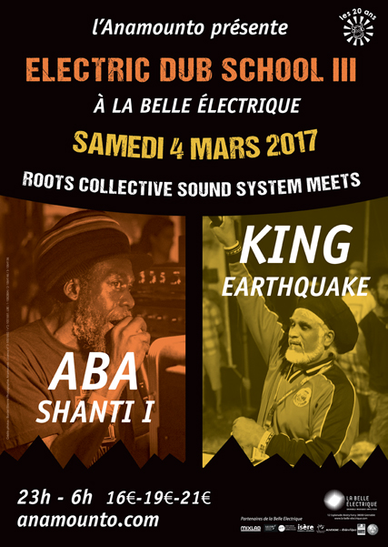 L’association Anamounto est heureuse, pour ses 20 ans, de vous présenter l’Electric Dub School #3 le samedi 4 Mars à la Belle Electrique avec Aba Shanti I, King Earthquake et bien sur le Roots Collective sound system !! Evènement unique et exceptionnel à Grenoble !
