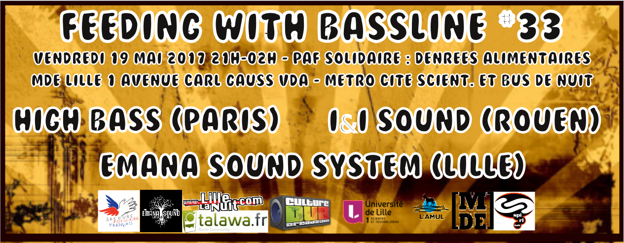 Pour cette 33ième édition de ses Sound System Solidaires, le projet Feeding With Bassline aura l’honneur d’accueillir le High Bass Sound (Paris) et le I&I Sound (Rouen) , et sera sonorisé comme à l’habitude par Emana Sound System. Afin de remplir sa fonction solidaire, le PAF ne sera pas financier : pour accéder à la danse, il vous suffira d’apporter des denrées alimentaires qui seront redistribuées aux plus démunis.